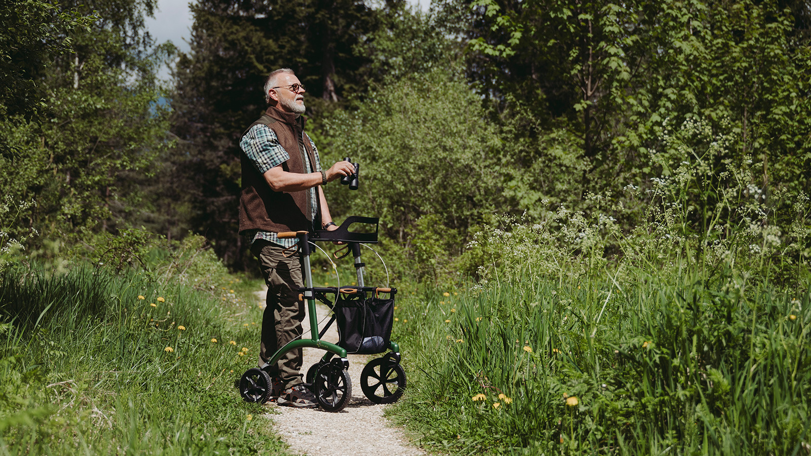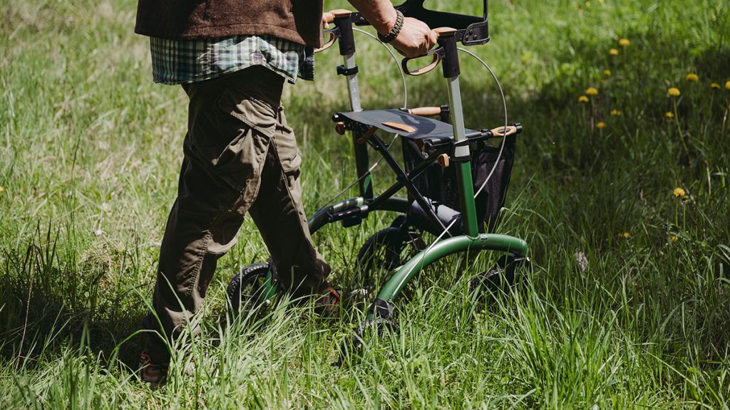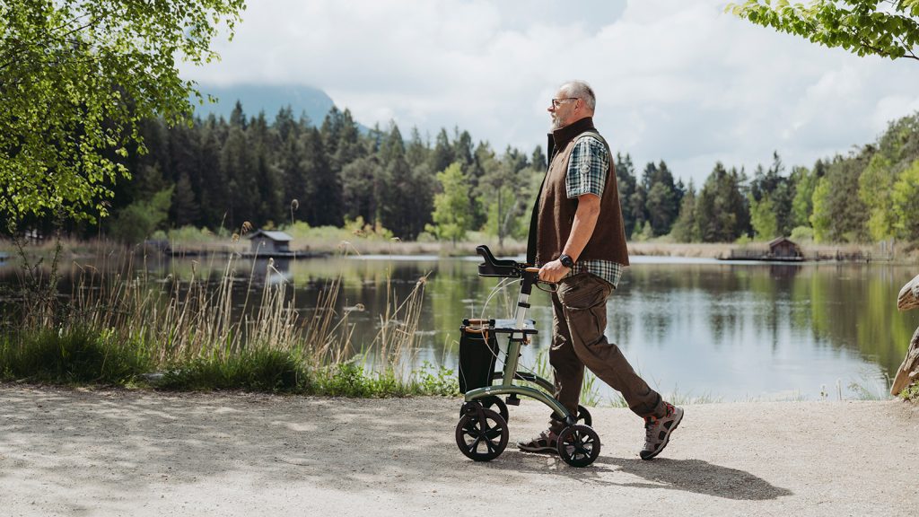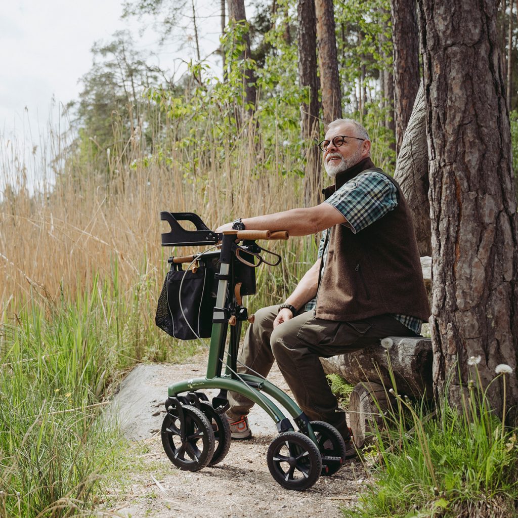 Da kommt seine Frau Sabine – mit der Lösung in den Händen: einem Allround Rollator in Forest Green. Sie hatte sich beraten lassen, welcher Rollator für ihren Mann und seinen Wunsch, Zeit in den Bergen, im Wald und an den Seen zu verbringen, am besten geeignet ist.