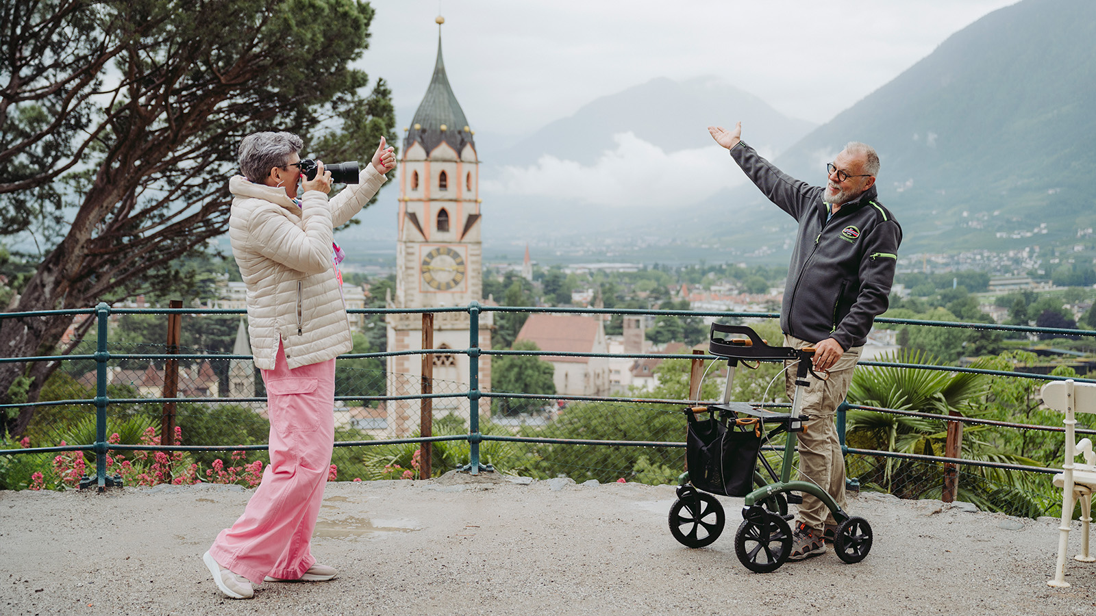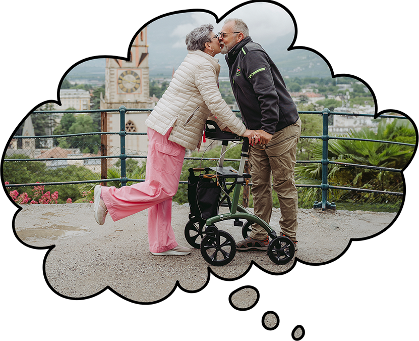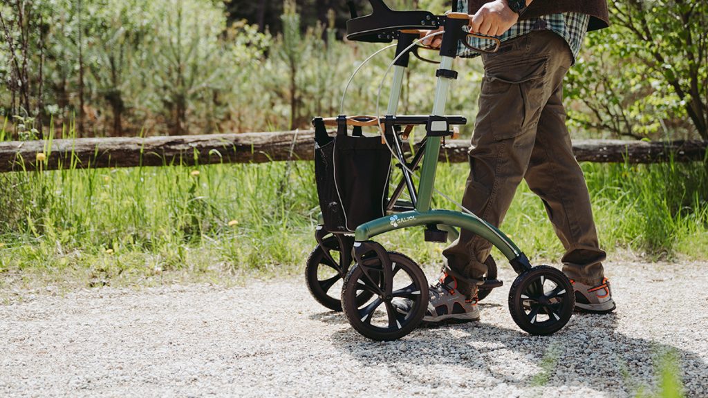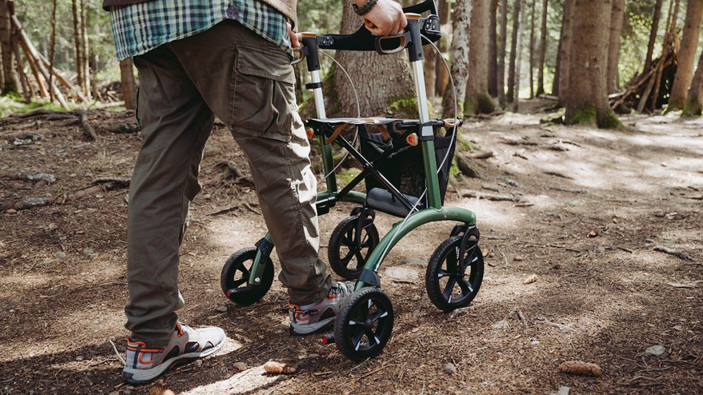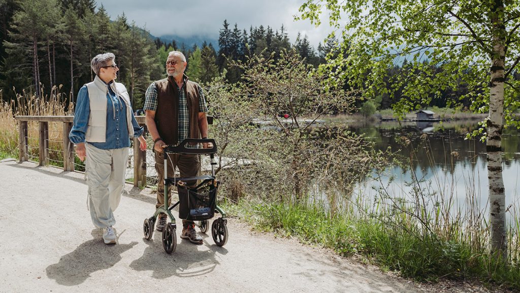 Da kommt seine Frau Sabine – mit der Lösung in den Händen: einem Allround Rollator in Forest Green. Sie hatte sich beraten lassen, welcher Rollator für ihren Mann und seinen Wunsch, Zeit in den Bergen, im Wald und an den Seen zu verbringen, am besten geeignet ist.