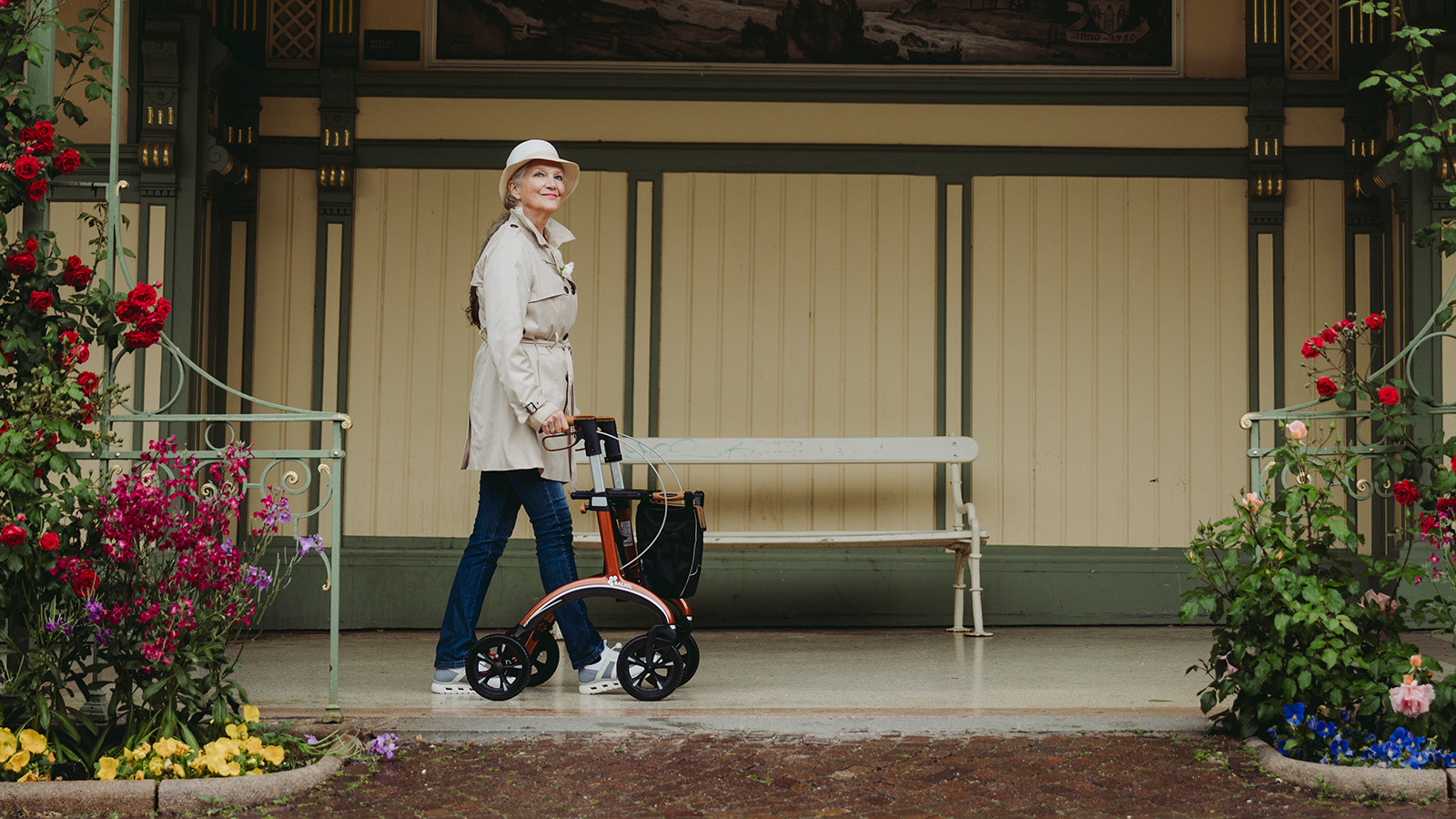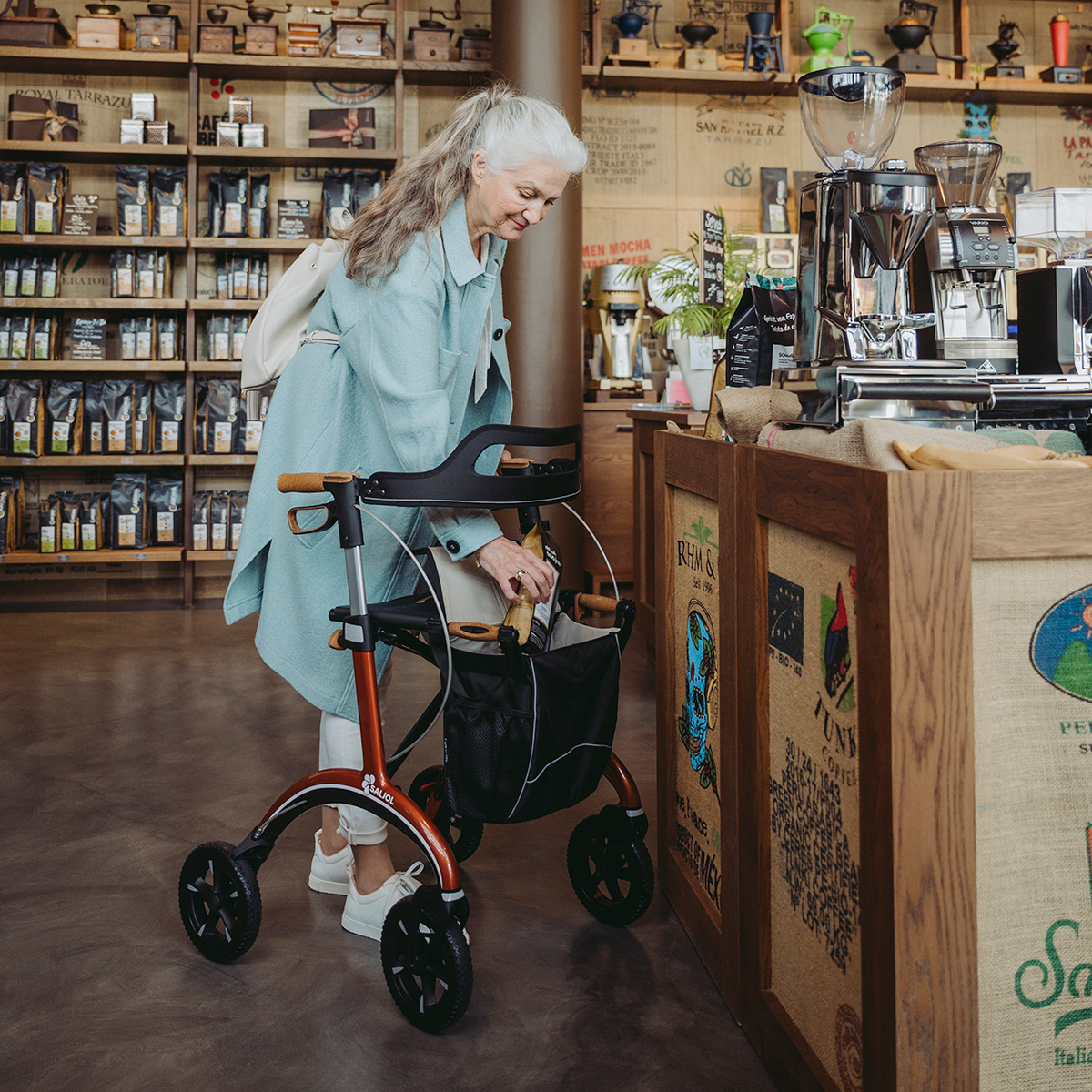 Just a few days later, Gina’s desired rollator arrives: the Carbon Rollator in Copper Red, just like her coffee machine. She can hardly wait to set off to one of her favourite places.