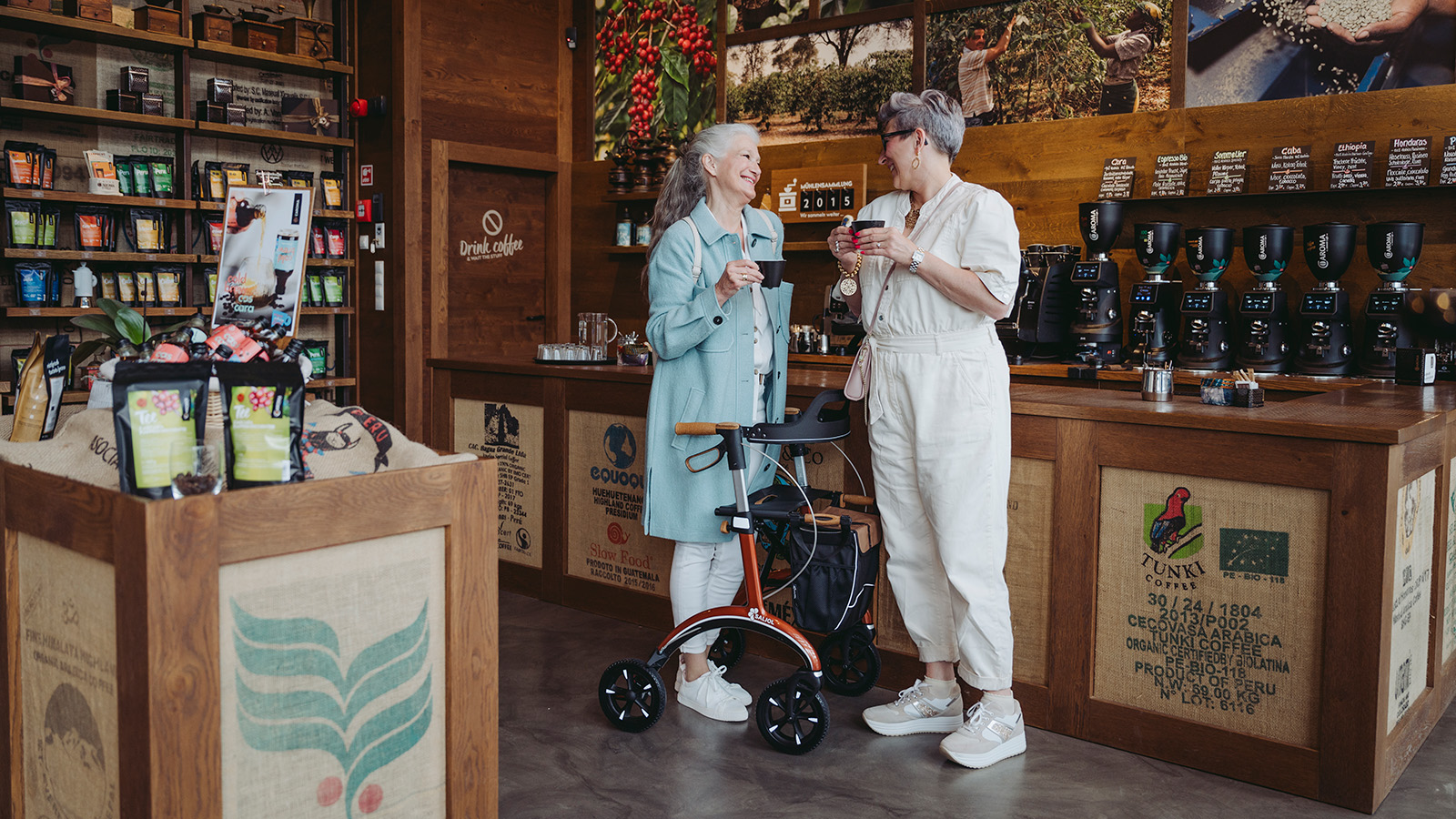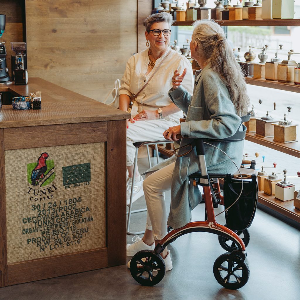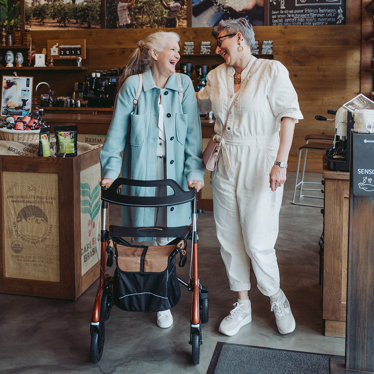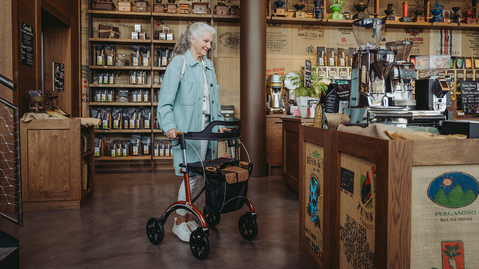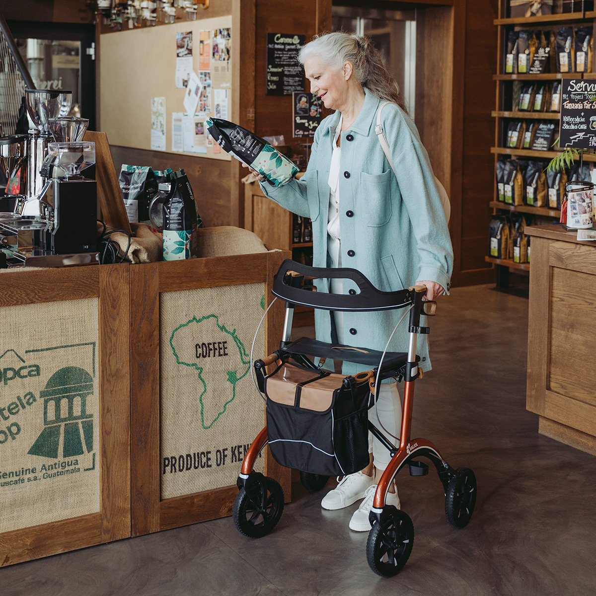 She has arranged to meet her friend Sabine. She will be amazed! Gina strolls through the coffee roastery with ease, soaking in the ambiance and aroma. With the rollator, everything feels much less strenuous, she notices. She feels more secure, as she always has something to hold on to and sit on. Her shopping is also neatly stored in the bag. Now she can truly enjoy the coffee with Sabine …